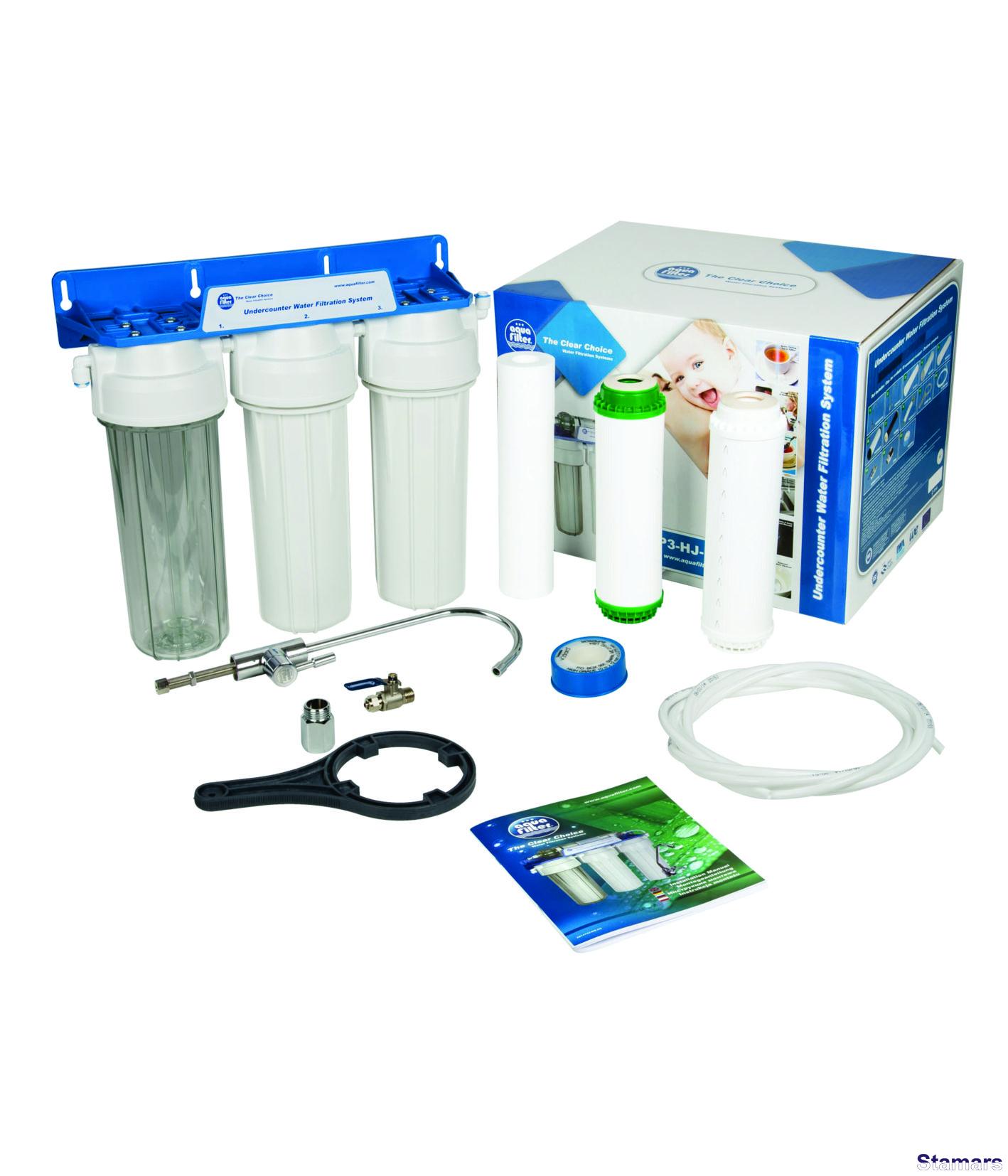 Trīspakāpju filtrācijas sistēma tiek aprīkota ar trīs kārtridžiem, kas attīra ūdeni no mehāniskiem piemaisījumiem (smiltīm, dūņām, rūsas un suspendētām vielām), hlora, pesticīdiem un organiskajām vielām, smagiem metāliem, sērūdeņraža, atdzelžo un mīkstina ūdeni, uzlabo ūdens smaržu un garšu. Ir iespēja izmantot dažādas kārtridžu kombinācijas. Filtrācijas sistēma tiek uzstādīta zem izlietnes