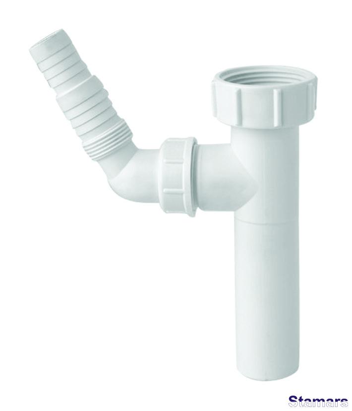 Vertikāls pagarinājums sifonas izlietnei 1,1/4″x32mm ar savienojuma uzgali veļas mašīnai vai trauku mazgājamai mašīnai. Caurlaidība – 70l/min. ar ūdens stabu 120 mm.