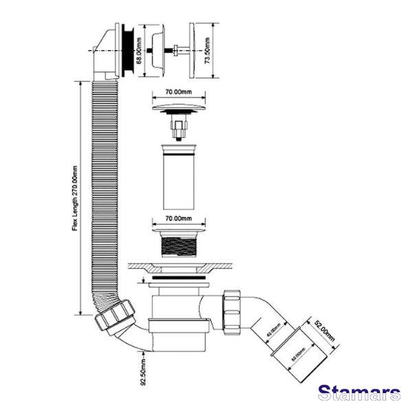 Atkritumu un pārplūdes komplekts vannai un dziļajai dušas paliktnei, kas ļauj tīrīt no augšas. Sifons ir aprīkots ar "click-clack" aizvēršanas un atvēršanas sistēmu. 1,1/2″x40/50 mm izeja.