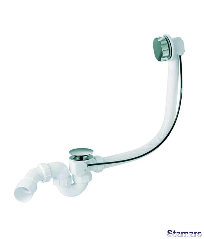 Balts notekas un pārplūdes komplekts vannai un dziļai dušas paliktnei ar kloķi un aizbāzni notekas aizvēršanai un atvēršanai. Poga izgatavota no ABS. 1,1/2″x40/50 mm izeja.