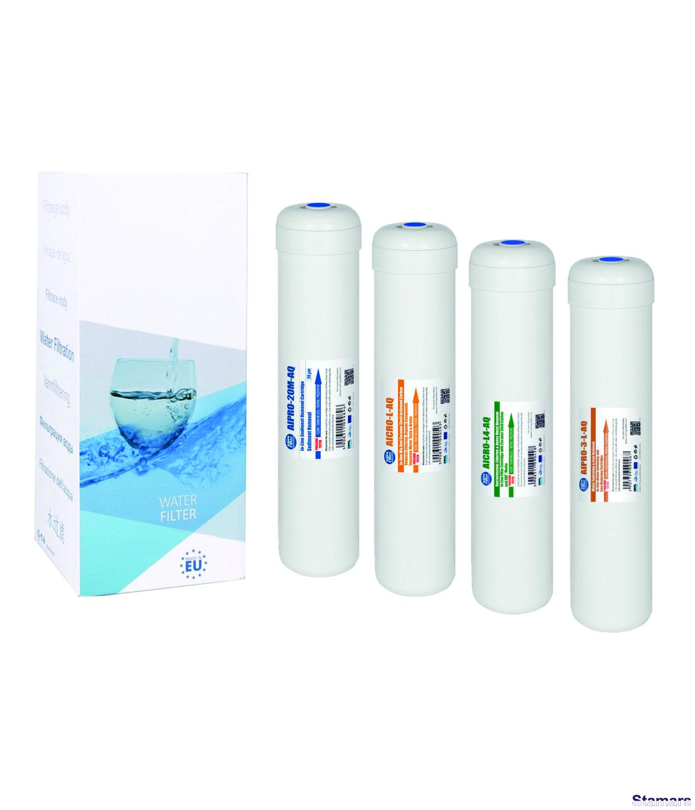 Komplekts EXCITO-ST sitēmām. Ietilpst četri lineārie kartr.: AIPRO-20M – kartr. no polipropilēna šķied., attīra ūdeni no meh. piesārņojumiem. AIPRO-3-L – Divpakāpju kartr. atdzelžo un mīkstina ūdeni. AICRO-L3 – Kartr. ar aktīvēto ogli no kokosu riekstu čaulas, attīra ūdeni no hlora un org. piesārņojumiem. AICRO-L4 - Divpakāpju kartr. KDF – novērš baktēriju un vīrusu veidošanu, pazemina smago metālu un dzelzs konc., kā arī attīra ūdeni no sērūdeņraža un pesticīdiem. Aktīvēta ogle no kokosu riekstu čaulas attīra ūdeni no hlora un org. piesārņojumiem, uzlabo ūdens smaržu un garšu. Darba temp. 2 - 45 oC.