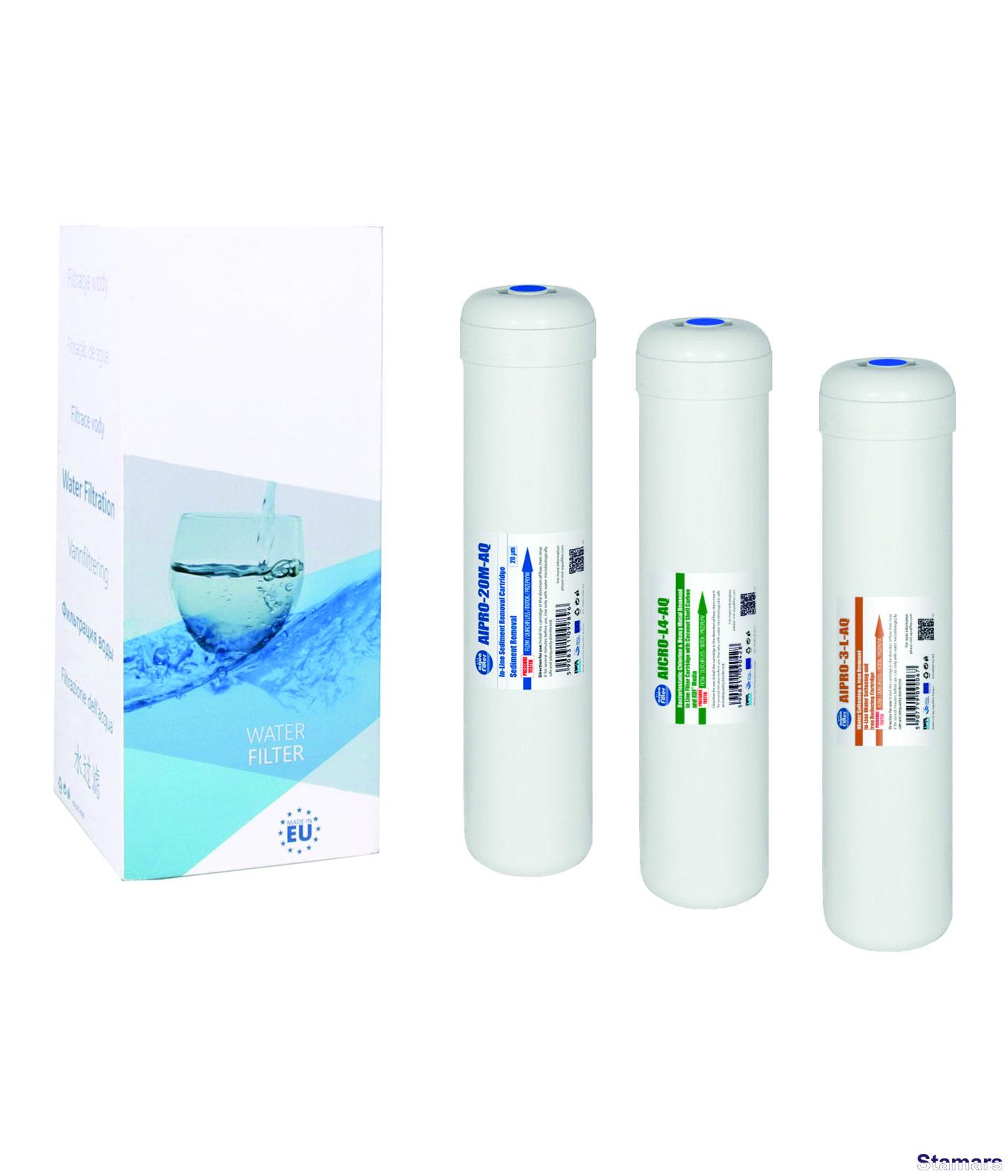 Komplekts EXCITO-ST sitēmām. Ietilpst trīs lineārie kartridži: AIPRO-20M – kartridžs no polipropilēna šķiedras, attīra ūdeni no mehāniskeim piesārņojumiem. AIPRO-3-L – Divpakāpju kartridžs atdzelžo un mīkstina ūdeni. AICRO-L4  - Divpakāpju kartridžs. KDF – novērš baktēriju un vīrusu veidošanos, pazemina smago metālu un dzelzs koncentrāciju, kā arī attīra ūdeni no sērūdeņraža  un pesticīdiem. Aktīvēta ogle no kokosu riekstu čaulas attīra ūdeni no hlora un organiskiem piesārņojumiem, uzlabo ūdens smaržu un garšu. Darba temperatūra 2 - 45 oC.