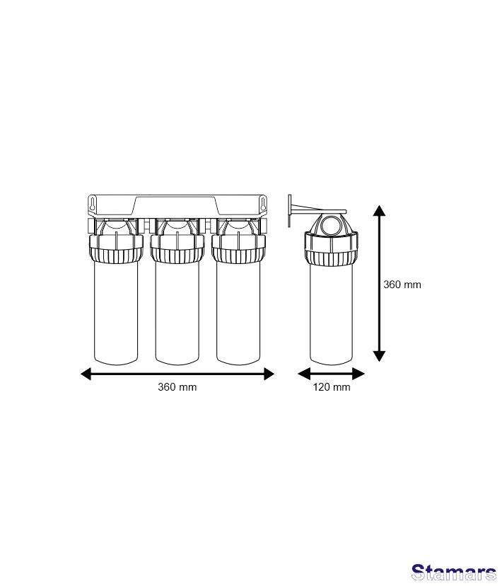 10” trīs korpusu filtrācijas sistēmas komplekts: trīsdalīgie korpusi ar caurspīdīgām kolbām, atgaisotājiem un misiņa vītņu ieliktņiem, kronšteinu, atslēgu un bakteriostatiskiem centralizācijas gredzeniem.