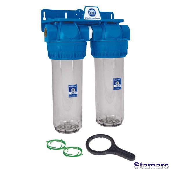 10” divu korpusu filtrācijas sistēmas komplekts: trīsdalīgie korpusi ar caurspīdīgām kolbām, atgaisotājiem un misiņa vītņu ieliktņiem, kronšteinu, atslēgu un bakteriostatiskiem centralizācijas gredzeniem.