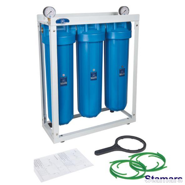 20” BigBlue trīs korpusu filtrācijas sistēmas komplekts: korpusi ar zilām kolbām, atgaisotājiem un misiņa vītņu ieliktņiem, metāla rāmi, atslēgu, manometriem uz ūdens ieejas un izejas un bakteriostatiskiem centralizācijas gredzeniem.