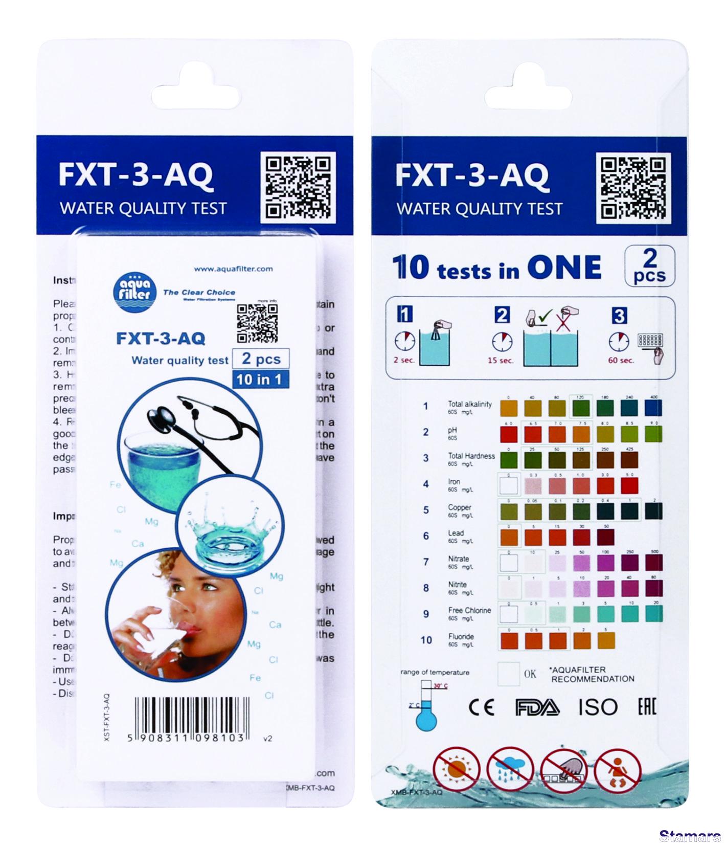 10 ūdens testu komplekts. (pH, sarmainība, hlors, dzelzs, cietība, nitrāti, nitrīti, varš, svins, fluors). Ar viena komplekta palīdzību var uztaisīt divu pilnus ūdens testus.