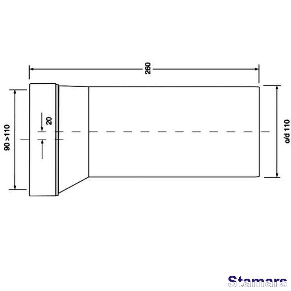 Kanalizācijas pieslēgums, īss 260mm, ekscentrisks ar 20mm nobīdi. Ieplūde 90-110mm ar lūpu blīvējumu, izeja 110mm.