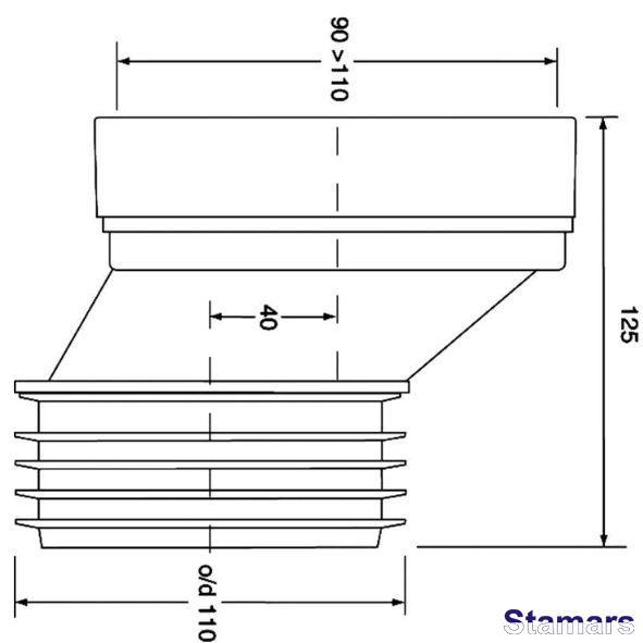 Kanalizācijas pieslēgums, īss 125mm, ekscentrisks ar 40mm nobīdi. Ieplūde 90-110mm ar lūpu blīvējumu, izeja 110mm ar atloka blīvējumu.